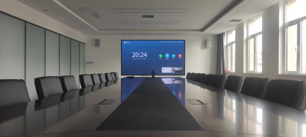● 在运营中心会议室的建设上,希望此空间能实现简约大气的企业文化风格,视频会议是其高频使用的场景,长方向的会议空间,开展远程视频会议时,会议桌远端的参与感较弱,希望能照顾到会议室中的每一个成员,让每一个参会人员不会因为距离而影响沟通。特别是在开多人远程视频讨论会的时候,以往经常会出现只闻其声不见其人的尴尬场面。